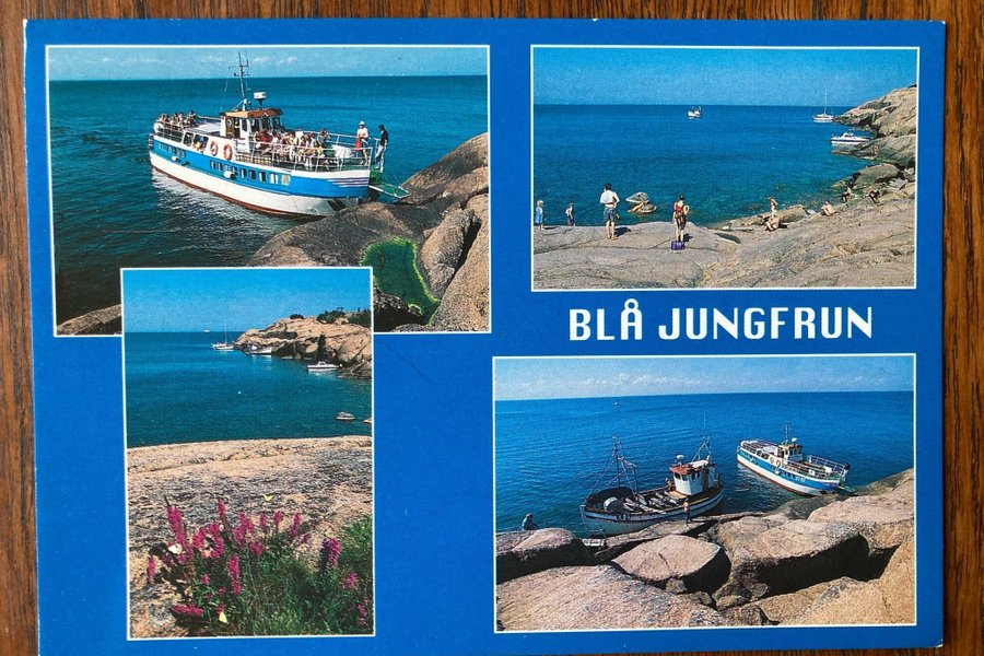 Vykort med motiv från Blå Jungfrun. Framsidan visar flera bilder av ön med båtar och människor. Baksidan har text om Blå Jungfrun, frimärke och stämpel från 2001-07-27.