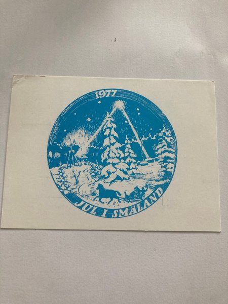 Ett julkort från 1977 med ett blått tryck av ett vintermotiv med texten "Jul i Småland".
