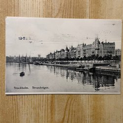 Ett vykort med motiv från Stockholm, Strandvägen. Adresserat till Nord Amerika. Stämpel finns.