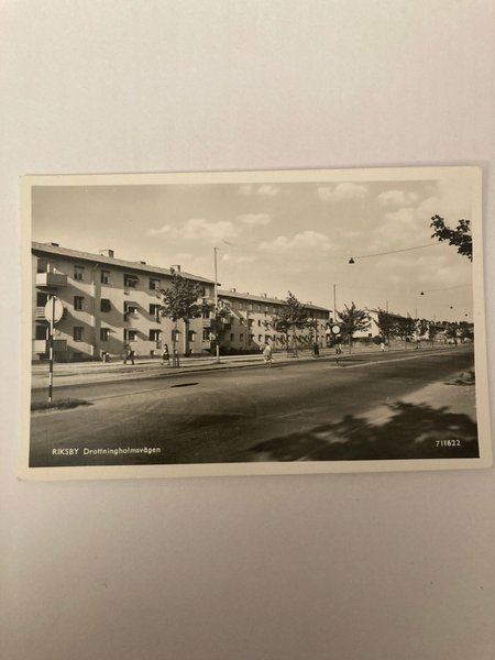 Ett svartvitt vykort som visar Riksby Drottningholmsvägen.