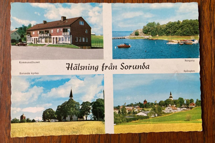Vykort med motiv från Sorunda. Framsidan visar Kommunalhuset, Rångsta, Sorunda kyrka och Spångbro. Baksidan är poststämplad med ett frimärke från Sverige.