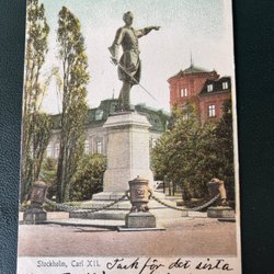Vykort med motiv av Karl XII staty i Stockholm. Fotografi av A. Blomberg. B. S. 420.