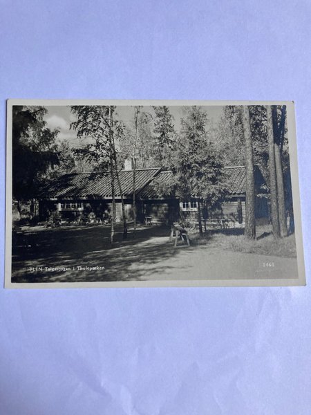 Ett svartvitt vykort föreställande FLEN, Telgastugan i Thuleparken. Vykortet har nummer 1461.