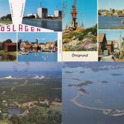 Ett vykort som visar bilder från Öregrund. Motiven inkluderar hamnen, hembygdsgården, kyrkan och Gräsöbaden 1980 tal Kortstorlek A6.