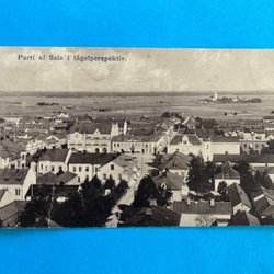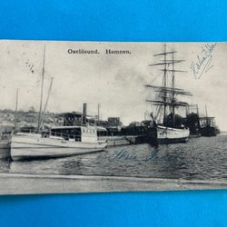 Vykort med motiv av Handelslokalerna i Söderfors. Kortet är poststämplat 1906 och adresserat till Fru Hulda Jonsson i Gysinge. Frimärkena är ett grönt frimärke med valören 5 öre och ett rött frimärke med valören 10 öre.