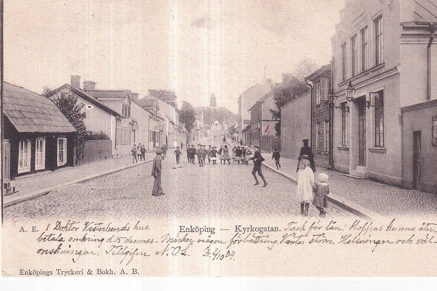 Vykort med motiv från Kyrkogatan i Enköping. Bilden visar en gata med hus och barn som leker. Text på kortet: "A. E. I Doktor Vesterleends hus. Enköping - Kyrkogatan. Tack för lån! Hoppas kunna återbetala omkring d. 15 dennes. Märker någon förbättring. Väntar större. Hälsningar och välönskningar. Tillgifne N.O.L. 8/10 04." Tryckt av Enköpings Tryckeri & Bokh. A. B.