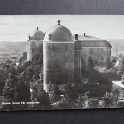 Vykort med bild av Uppsala Domkyrkan i snölandskap. Kortet är postgånget med frimärke och stämpel från 1 november 1923. Text på italienska finns på baksidan. Köparen betalar frakten