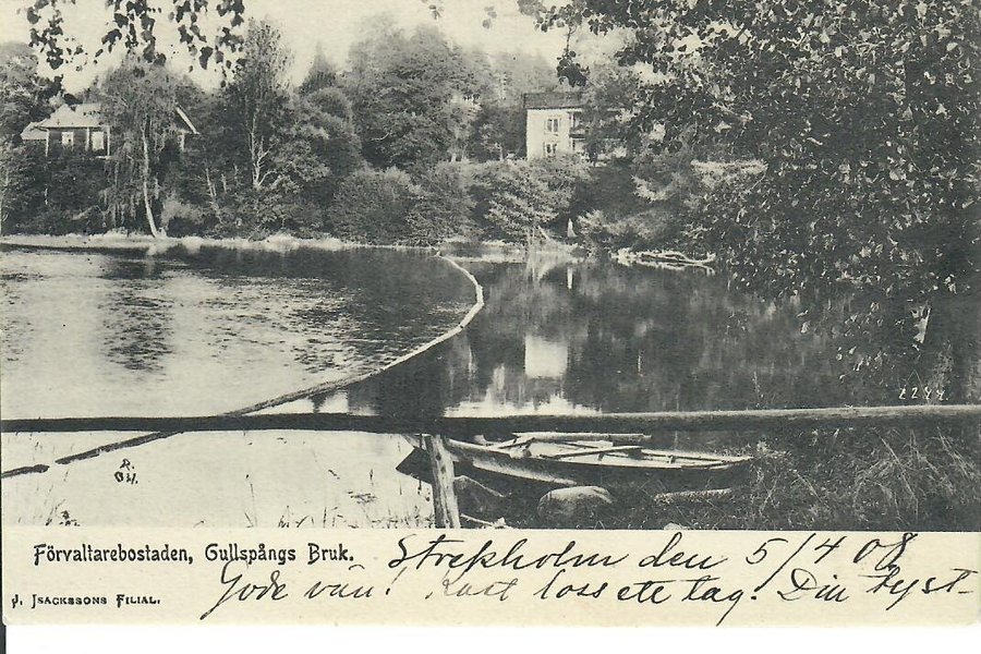 Vykort föreställande Förvaltarebostaden, Gullspångs Bruk. Motivet visar en stilla vattenyta med byggnader och träd i bakgrunden.