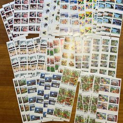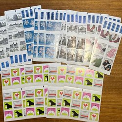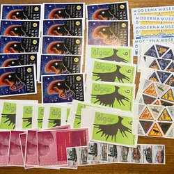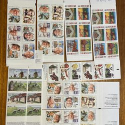 Frimärken med motiv från Olympiad, Sport, Fiskar, hav, fåglar, järnväg, Disney, snäckor och mycket annat. Sverige och övriga nordiska länder, postfriskt i serier, häften och 5-strip. Sverige FDC med vinjetter.
