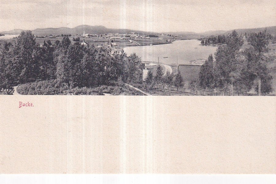 Vykort med motiv från Backe. Bilden visar en vy över bebyggelse, vatten och träd.