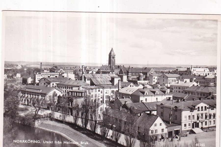Ett svartvitt vykort som visar en vy över Norrköping från Holmens Bruk. Vykortet har nummer 46145.