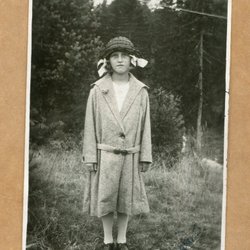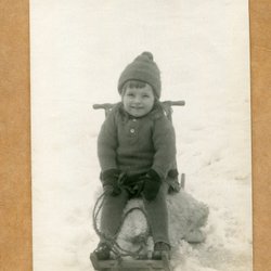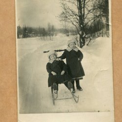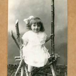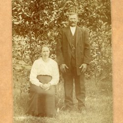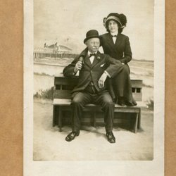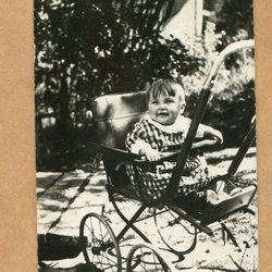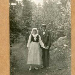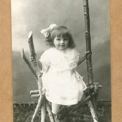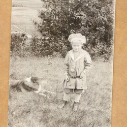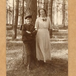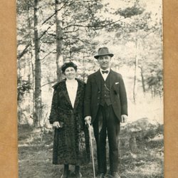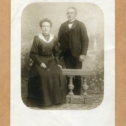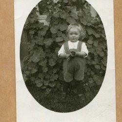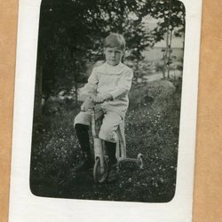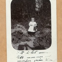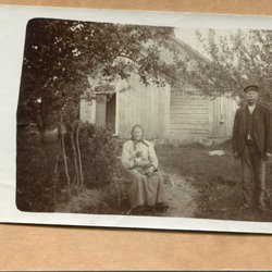 Ett fotografi som visar en man med en kratta framför en stor byggnad. Baksidan av fotografiet är blank med linjer för adressering.