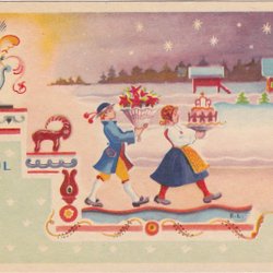 Ulf Aas-Gutt funnet metode til å fore en grisunge grunnet plassmangel hos mor. Melk på ei flaske og tåtesmokk går bra. Postet 20.XII.44. Norge kr 28 , Sverige kr 36 og verden kr 42