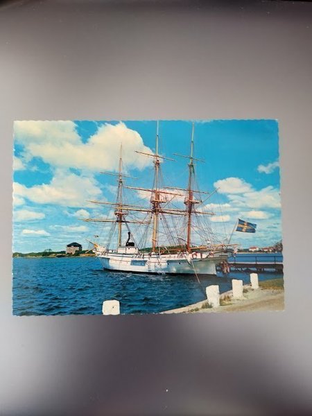 Ett vykort föreställande ett vackert fartyg med svensk flagga i hamn. Blå himmel med moln.