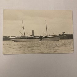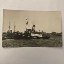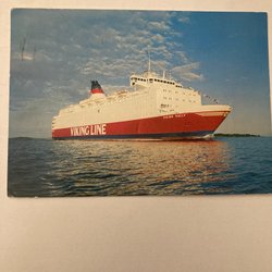 Ett vykort som föreställer fartyget Helsinki Express. På baksidan står det Helsinki-Slite-Karlskrona-Rønne-Travemünde.