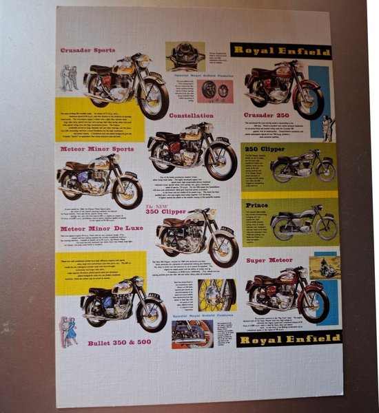 Ett vykort med olika Royal Enfield modeller som Bullet 350 & 500, Meteor Minor De Luxe, Meteor Minor Sports, Crusader Sports, The NEW 350 Clipper, Constellation, Super Meteor, Prince och Crusader 250.