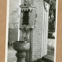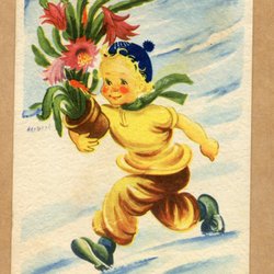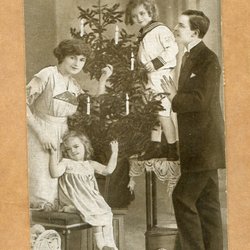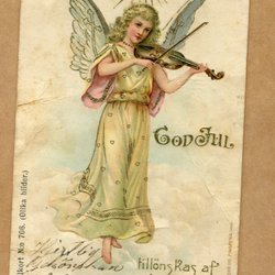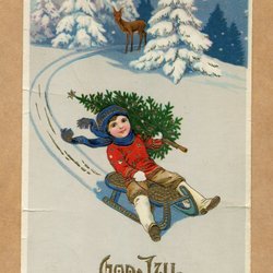 Ett julkort med motiv av ett vinterlandskap med en kyrka i bakgrunden. Kortet är poststämplat och har två frimärken.