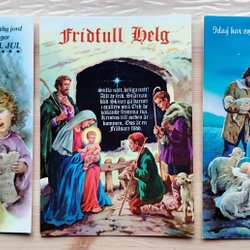 Fyra retro julkort med religiösa motiv från Evangeliitjänst Göteborg .