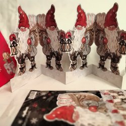 Två dubbla vykort med motiv av tomtar i en verkstad. Kortet är till förmån för Drottning Silvias Jubileumsfond för forskning om handikapp och barn. Inuti kortet står det "God Jul Gott Nytt År".