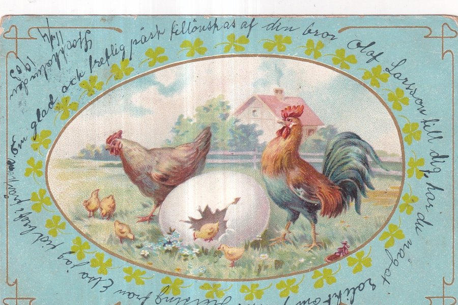 Ett äldre påskkort med motiv av höns och kycklingar.plundrat på frimärke