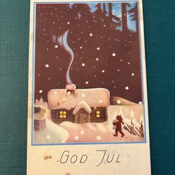 Ett julkort med en illustration av en räv i ett vinterlandskap med texten "God Jul Gott Nytt År". Detta är ett litet kort Postgånget