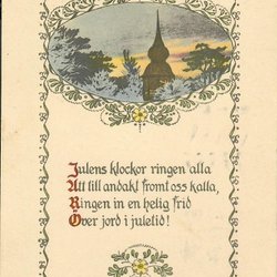 Ett vykort med ett vintermotiv. På bilden syns ett snöigt landskap med människor och