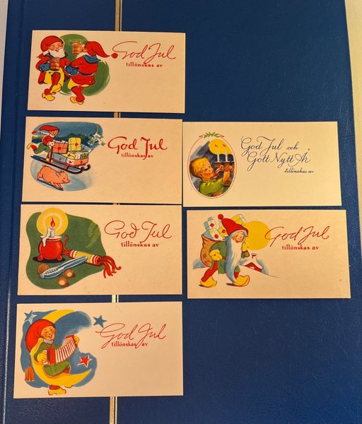 6 st gamla julkort med olika motiv. Korten är i varierande färger och föreställer bland annat tomtar, barn och juliga symboler. Ett av korten har texten "God Jul och Gott Nytt År" medan de andra har "God Jul".