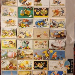 Två påskkort med motiv av höns och en kvinna med ett stort ägg. Korten är poststämplade.