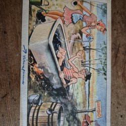 Ett vykort med ett motiv av en magiker omgiven av pillerburkar och en kanin i en hatt. Baksidan har text på danska och en logotyp kortstorlek A6.