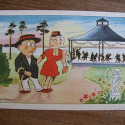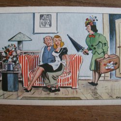 Ett vykort med en teckning av två figurer. Den ena figuren dricker ur en flaska medan den andra figuren försöker stoppa honom. Signerad Bror-Eric och daterad 1990. Från Hälsingland. Nr.8