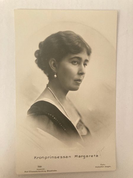 Ett fotografi av Kronprinsessan Margareta. Fotografiet är märkt med 'Foto: Hofatelier Jaeger' och 'Axel Eliassons Konstförlag, Stockholm'.