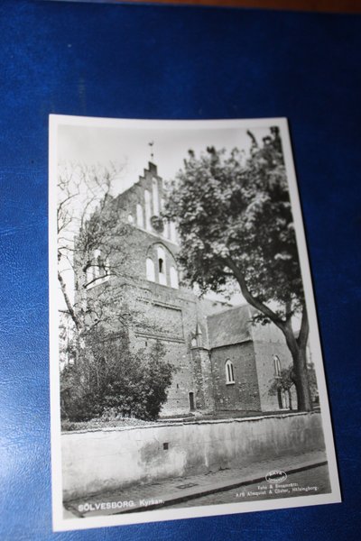 Ett svartvit vykort som visar Sölvesborgs kyrka. Fotograf är A/B Almquist & Cöster, Hälsingborg.