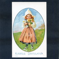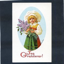 Flicka i folkdräkt kastar snö Härligt nyårskort sign ADÈLE SÖDERBERG