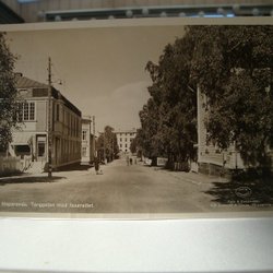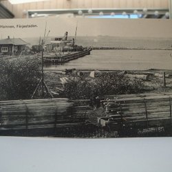 Ett vykort med ett motiv av en båtbyggare och några män som tittar på båten. Konstnären heter Skogsberg. Baksidan har ett frimärke och en stämpel.