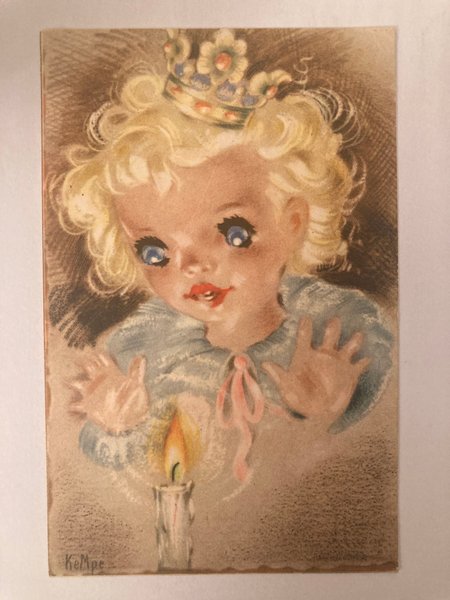 Ett vintage kort med en illustration av ett barn med en krona och ett ljus.