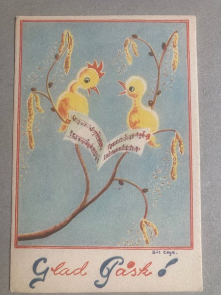 Ett sött påskkort med två fåglar som sjunger från ett notblad. Kortet har en röd ram och texten "Glad Påsk".