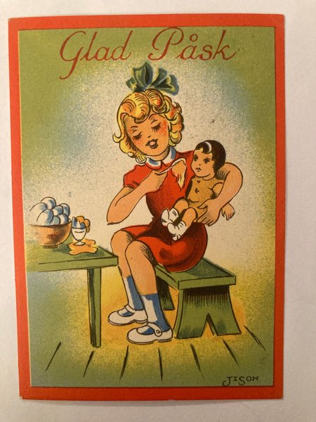 Ett sött påskkort med en flicka som håller en docka. På bordet står en skål med ägg.