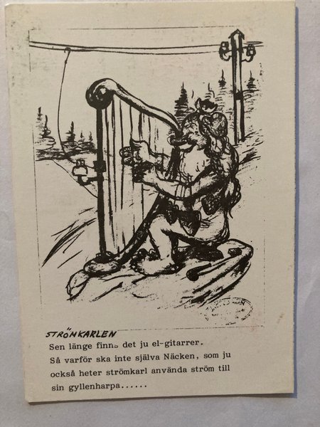 Ett tryck med en teckning av Strömkarlen med texten 'Sen länge finns det ju el-gitarrer. Så varför ska inte själva Näcken, som ju också heter strömkarl använda ström till sin gyllenharpa......'