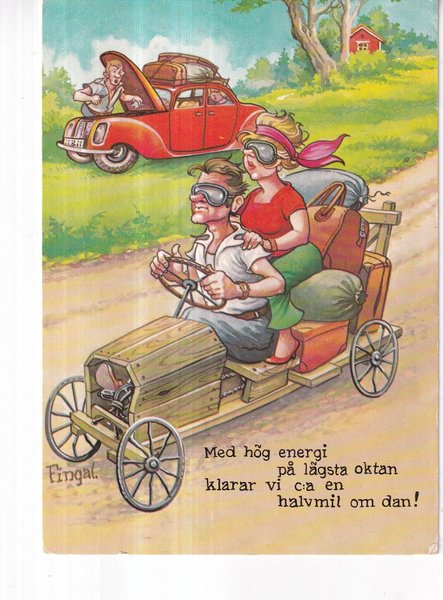 En affisch med motiv av en bilresa. Texten lyder: Med hög energi på lägsta oktan klarar vi ca en halvmil om dan!