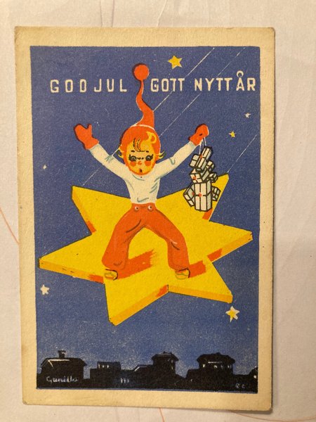 Ett charmigt julkort med en illustration av en tomte på en stjärna. Motivet inkluderar texten 'Goo Jul Gott Nytt År' och en silhuett av en stad i bakgrunden.