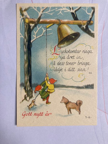 Ett julkort med illustration av tomtar, hundar och en klocka i ett vinterlandskap. Texten lyder "Gott nytt år" och "Lyckotomtar ringa nya året in, Må dess toner bringa Glädje i ditt sinn!".