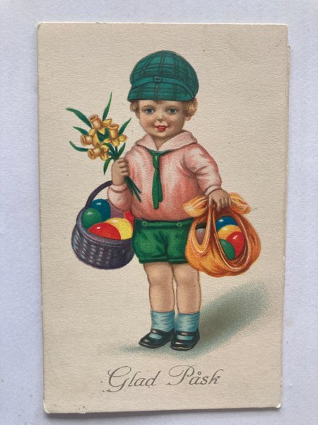 Ett sött påskkort med en pojke som bär påskägg och blommor. Texten "Glad Påsk" står längst ner på kortet.