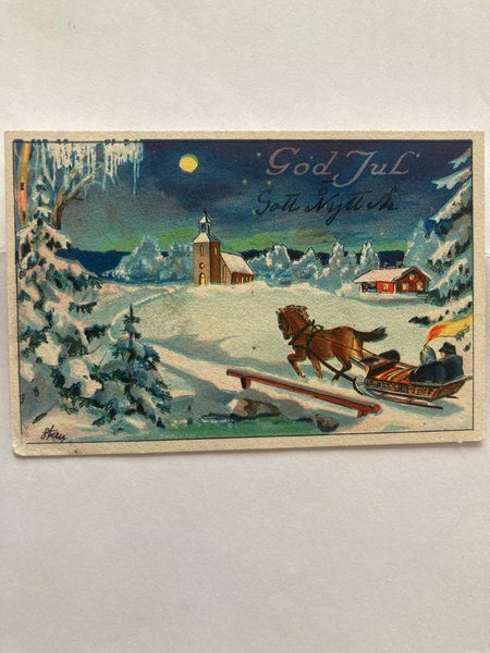 Ett julkort med vintermotiv. På kortet syns en häst och släde, en kyrka och texten "God Jul Gott Nytt År".