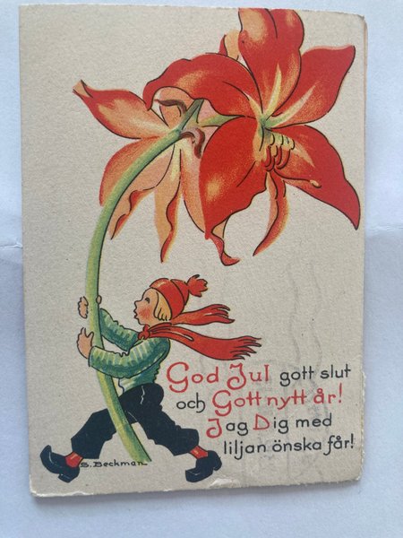 Ett julkort med motiv av en pojke och en blomma. Texten lyder: God Jul gott slut och Gott nytt år! Jag Dig med liljan önska får! Signerad S. Beckman.