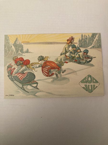 Ett julkort med motiv av barn som åker släde i ett vinterlandskap. Signerad Aina Stenberg.