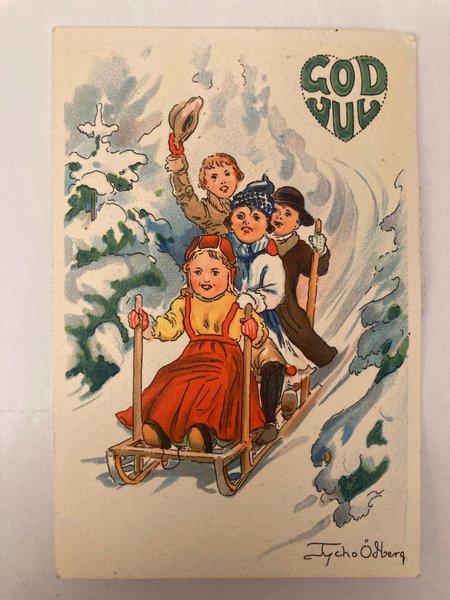 Ett julkort med barn på en släde i snön. På kortet står det "God Jul".