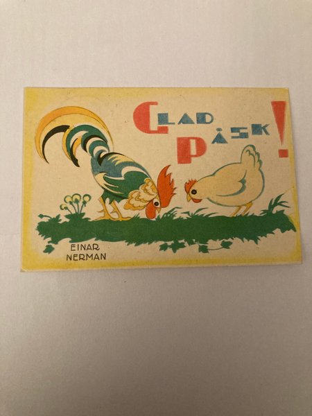 Ett sött påskkort med en tupp och höna. Signerad Einar Nerman.