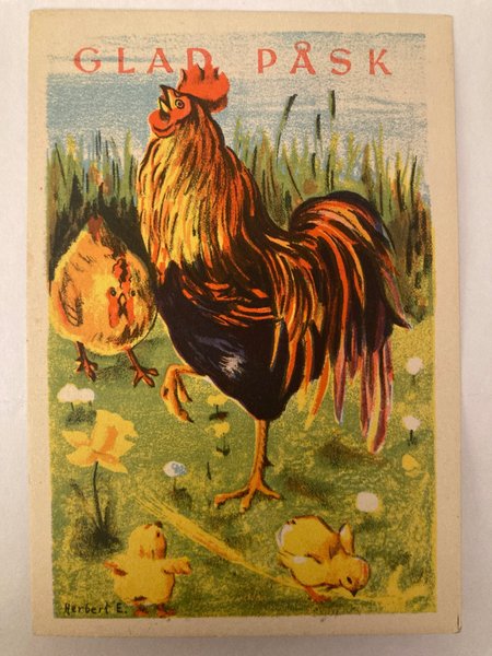 Ett påskkort med en tupp, höna och kycklingar. Kortet har texten 'Glad Påsk'.