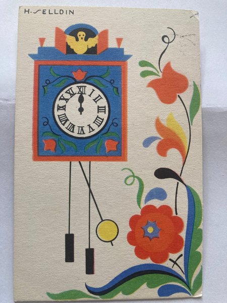 Ett vykort med en illustration av en klocka och blommor.