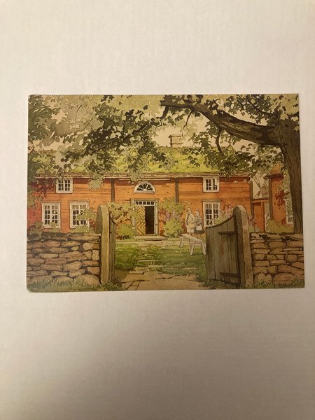 En affisch med ett vackert motiv av ett hus med trädgård.